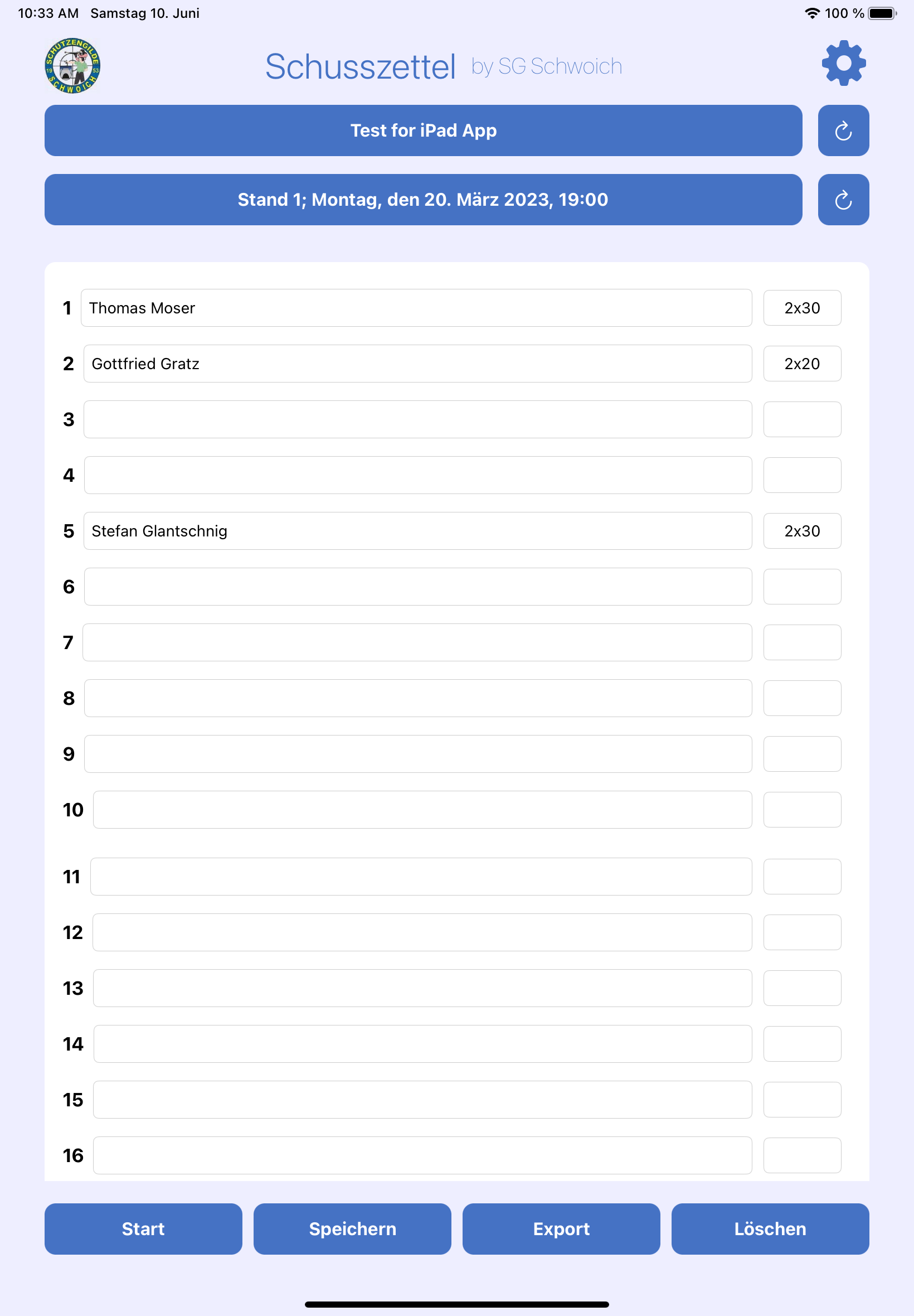 Die Schusszettel App erlaubt es, auf einem Apple iPad, die Trefferaufnahme von SGKP Bewerben durchzuführen. Die Summen werden automatisch berechnet. Die App ist für das Bewerbsystem der Schützengilde Schwoich ausgelegt. Sie kann aber auch ohne dieses Backendsystem verwendet werden, dann werden die Resultate am Ende einfach nicht gespeichert, die Schusszettel können aber gedruckt werden. Die App ist im iPad AppStore (nicht im iPhone AppStore) verfügbar. Wer an dem temporären Modus interessiert ist, der kann im Demo Video auf Minute 11 vorspulen.