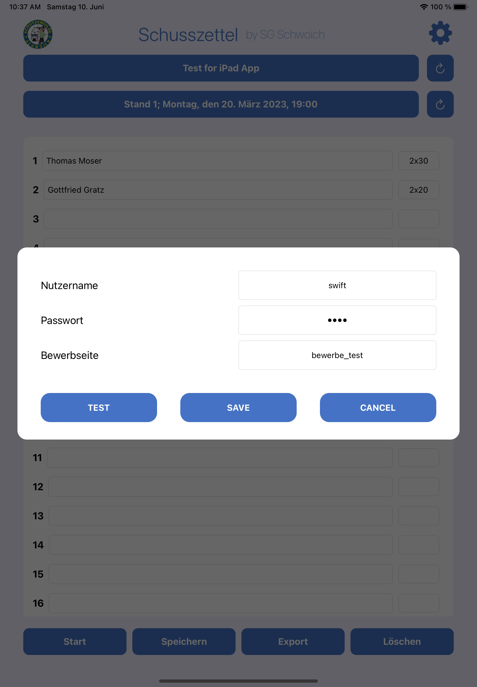 Für die Testinstanz können die Zugangsdaten "swift", "1911" und "bewerbe_test" verwendet werden. Nach Neuinstallation sind diese Daten voreingestellt.