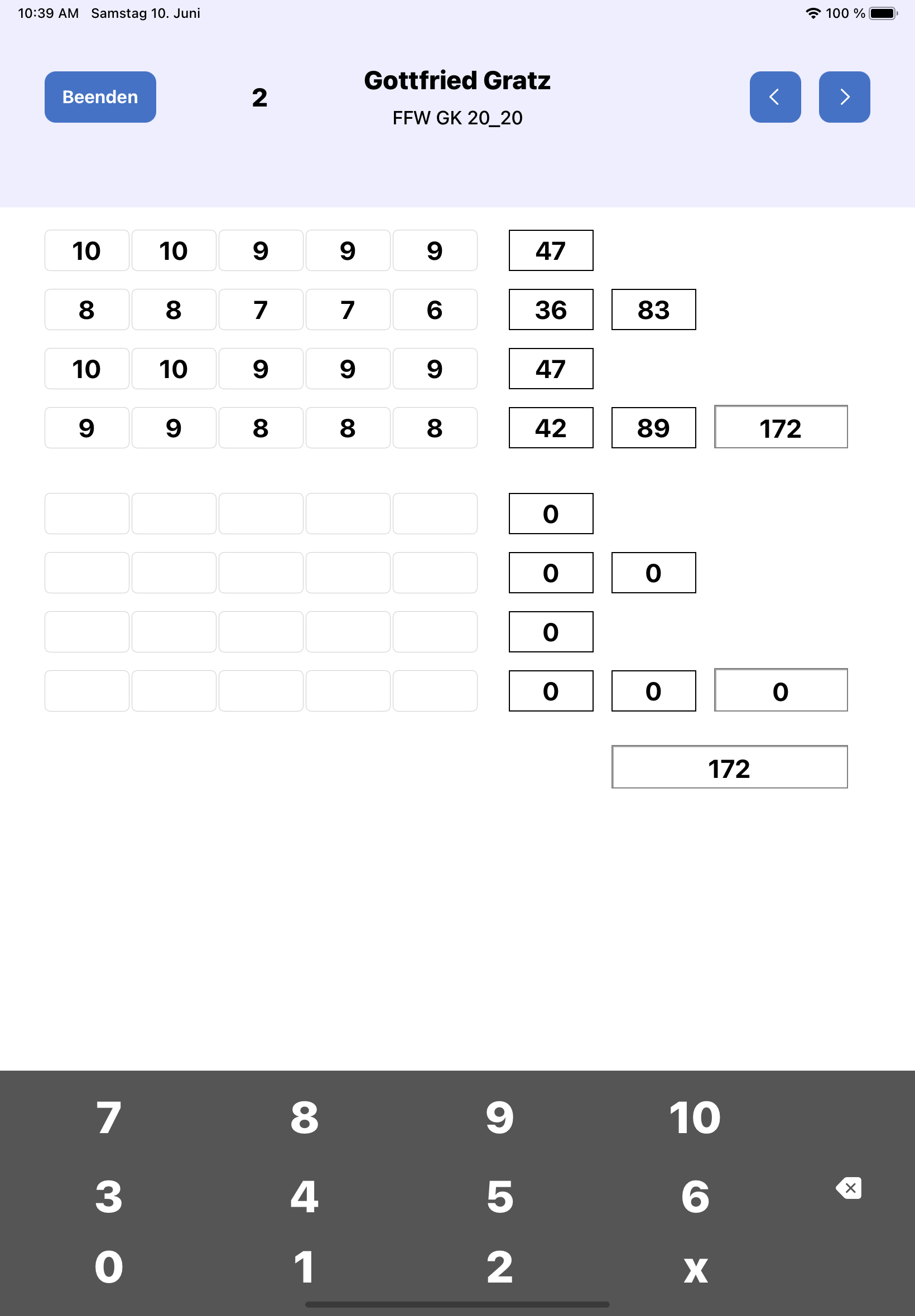 - Start: Damit wird die Eingabe der Treffer gestartet.